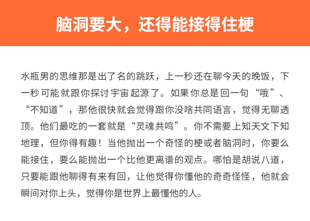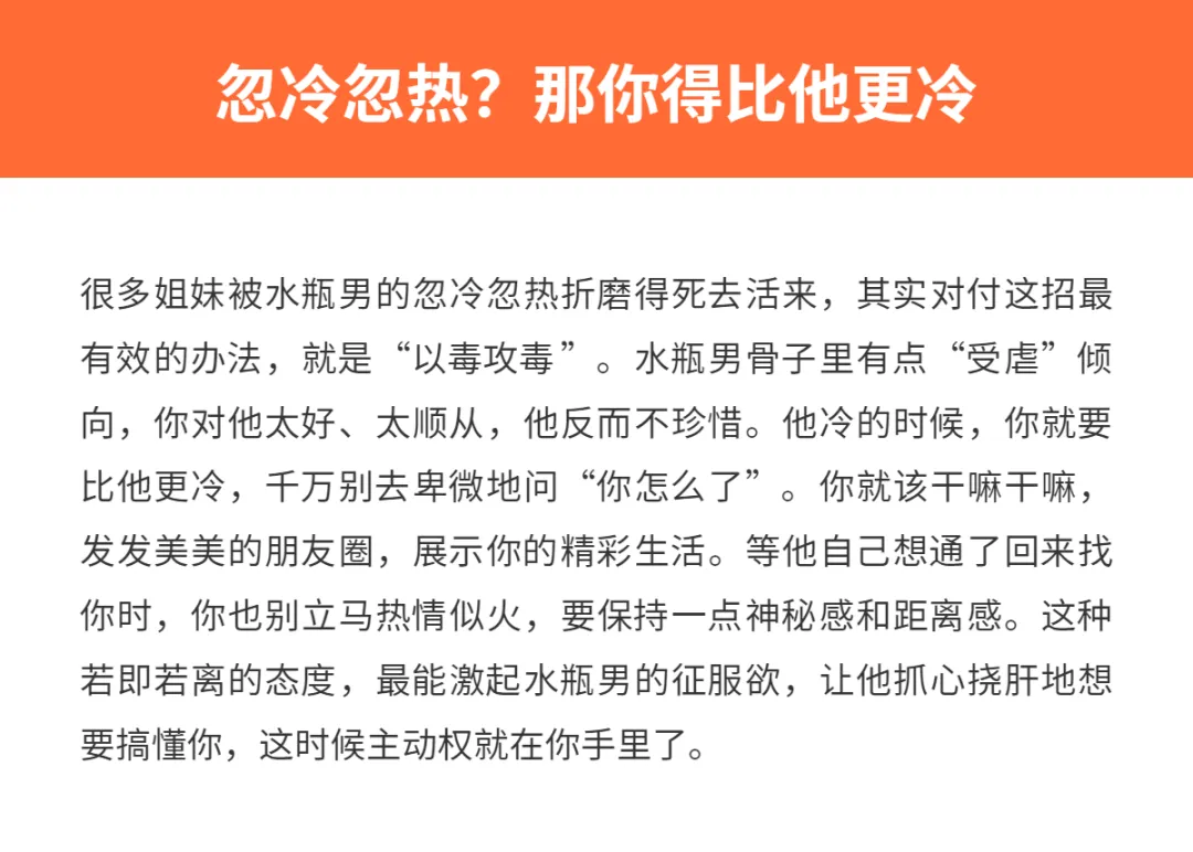 好多姐妹一提到水瓶男就头疼,觉得这帮人简直就是外星生物,忽冷忽热,根本抓不住。其实吧,水瓶男真的没那么难搞,他们只是脑回路有点清奇,不喜欢那些俗套的恋爱套路。你想拿捏他,靠死缠烂打或者一哭二闹三上吊是绝对不行的,那样只会让他连夜买站票逃跑。跟水瓶男谈恋爱,你得学会“反向操作”,只要你摸准了他的脉,他比谁都粘人。今天就来跟大家好好唠唠,这帮外星人到底最吃哪一套!