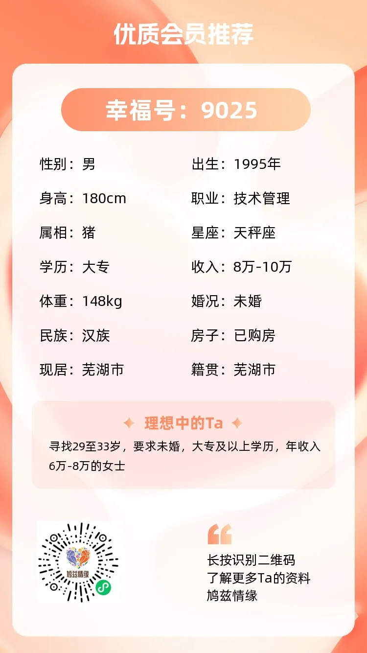 如果你也是芜湖单身,不想再“瞎找”,不想再等“缘分随机降临”,就来芜湖鸠兹情缘吧!这里有和你一样认真找对象的人,有8年专业和服务帮你铺路,下一个晒结婚证的,就是你!
