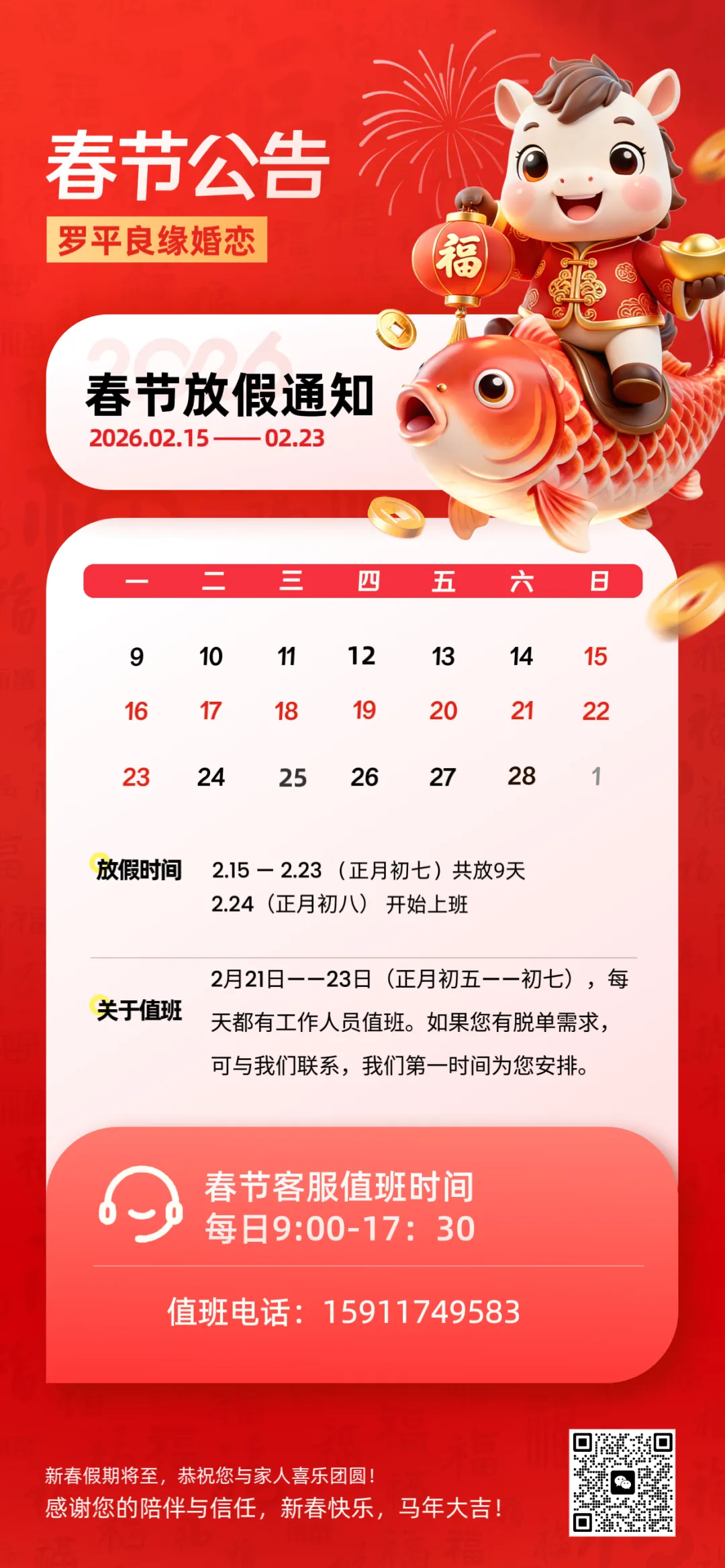 岁序更替,华章日新。值此马年新春佳节来临之际,罗平良缘婚恋全体工作人员向您致以最诚挚的节日问候和最美好的新春祝福!感谢大家过去一年对我们工作的信任、支持与陪伴,每一份相遇的喜悦,每一段良缘的开启,都离不开您的参与和托付。