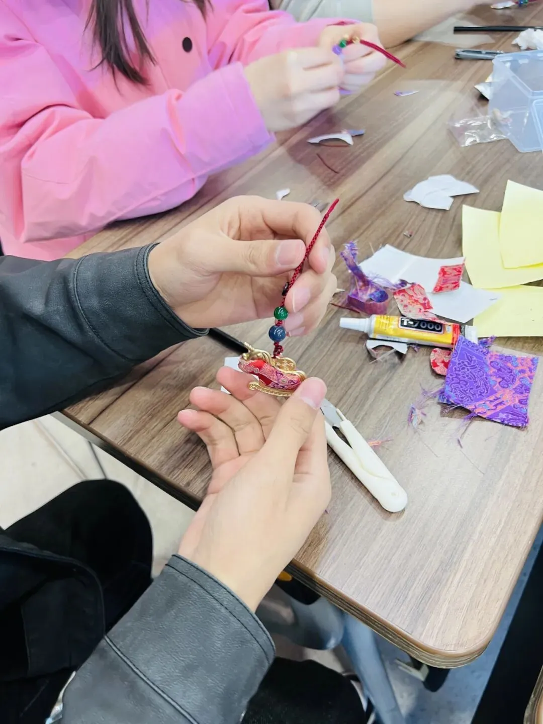 这次手作的内容是制作新年小马配饰,蕴含新年马到成功之意。大家认真学习宋锦配色技巧,打磨每一个细节,主动帮助身边的伙伴一起完成作品。在共同创作的时光里,小伙伴们慢慢打开心扉,从宋锦手作聊到生活日常,从兴趣爱好谈到人生期许,陌生感悄然消散,好感在欢声笑语中慢慢沉淀。每一件宋锦手作,都承载着默契与心意,成为了这场相遇最珍贵的纪念。