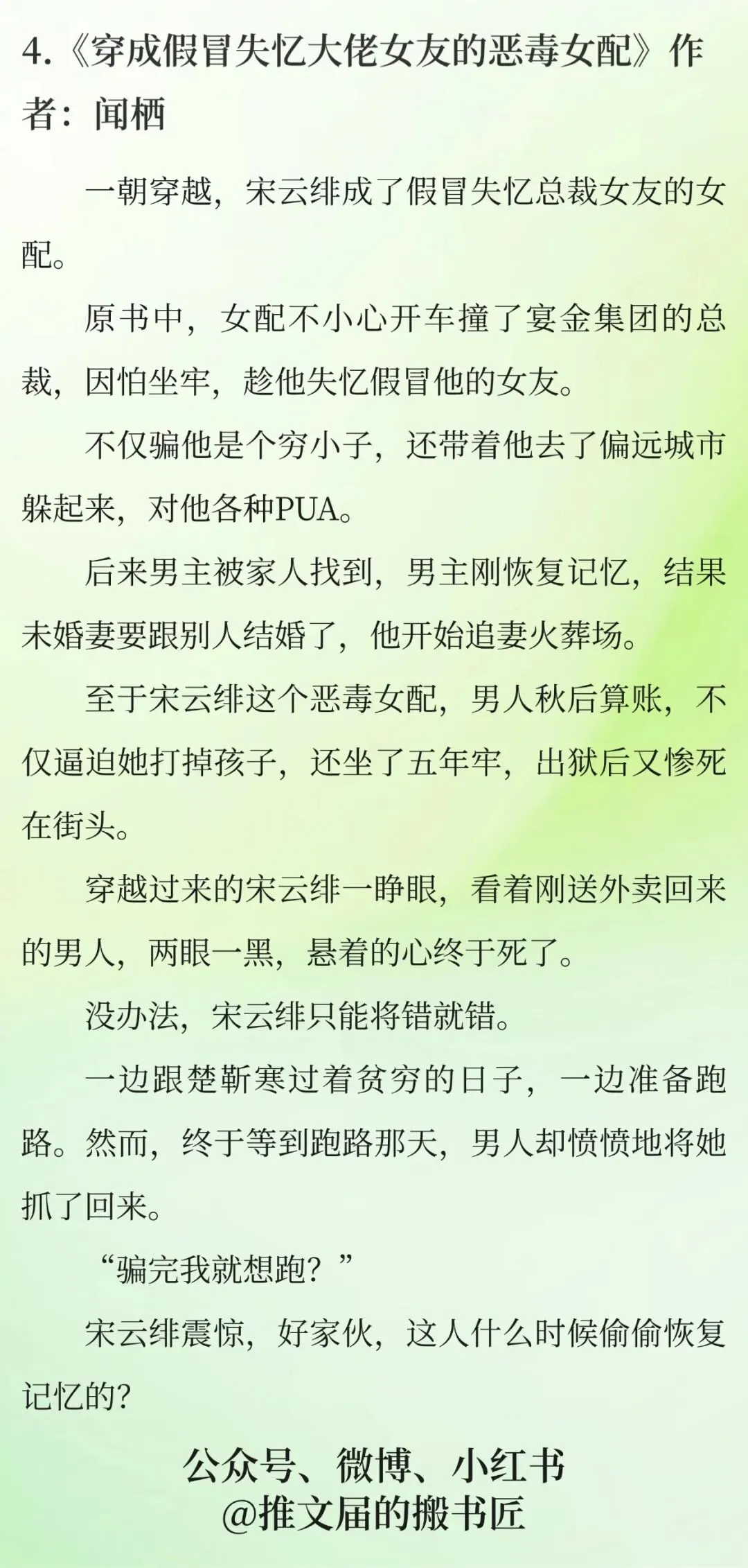 好文推荐|《穿成假冒失忆大佬女友的恶毒女配》by闻栖女主穿成书中恶毒女配,原主撞得失忆大佬后假冒其女友,还将人骗去小城伪装成穷小子,对他百般打压。女主知晓原主结局凄惨,只能将错就错维持身份,一边假意相处一边暗中筹谋跑路,失忆大佬性情温和,依赖并倾心于女主,女主在日常相处中也逐渐动情。男主恢复记忆后,并未报复,反而认清真心,主动追妻,女主放下顾虑,二人解开身份误会,携手面对家族与原剧情阻碍,最终走到一起。穿书失忆梗搭配同居日常,剧情轻松有笑点,人设立体,感情发展自然,文笔流畅好读。下期推文再见