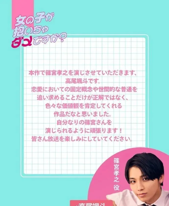 此次是27岁的高尾飒斗与22岁的志田琥珀首次合作主演剧集,两人的搭档从官宣起便引发观众热议。作为唱跳组合ONE N’ONLY的成员,高尾飒斗近年逐步深耕影视领域,此前参演《战斗之王!!我们会再次崛起》《缘君的反差太犯规了》等作品,积累了扎实的表演经验,此次挑战精英商社职员筱宫孝之,是他首次担纲漫改恋爱剧男主,角色身上的精英外表与内心自卑的反差,成为其表演路上的全新挑战。而志田琥珀凭借《暴太郎战队DON BROTHERS》中鬼头遥一角爆红,以灵动的表演和极具特色的颜艺收获大批粉丝,后续又参演《传说头目 翔》《为什么是我来神说教》等作品,此次饰演24岁职场女性梶谷美月,将诠释角色从渴望“普通幸福”到正视自我情感需求的成长,与她此前的特摄剧角色形成鲜明反差,展现多元表演风格。