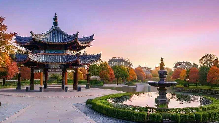 光与影的交织写下秋的温柔,夕阳的余晖在天边的云中画出对秋的眷恋,亭子被一丛一丛月季花包裹着。