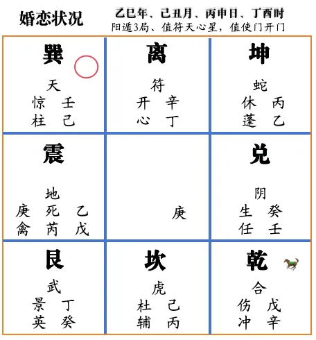 大家好,今天我来讲解一个关于奇门遁甲婚恋感情类的实战卦例。1997年(丁丑年)出生女子问与丈夫的感情状况及走向。问测时间为2026年1月22日18点33分,对应四柱乙巳年、己丑月、丙申日、丁酉时。节气为大寒,落在坎宫,阳遁局,丙申日符头甲对应地支午,上元局,故定局为阳遁3局。地盘排三奇六仪,戊落在震3宫,己落在巽4宫,庚落在中5宫,辛落在乾6宫,壬落在兑7宫,癸落在艮8宫,丁落在离9宫,丙落在坎1宫,乙落在坤2宫。丁酉时属于甲午旬,甲遁在辛之下,故值符天心星,值使门开门。转动天盘,天心星落在离宫。转动人盘,开门落在离宫。转动神盘,小值符落在离宫,其余按照顺时针顺序排布。甲午旬中地支辰、巳空,对应巽宫空亡。马星亥对应在乾宫。至此,关于婚恋感情的奇门盘就排完毕了。图1:女子婚恋状况奇门遁甲格局