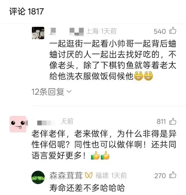 反观同性搭伙的美好,恰恰戳中了老年人最核心的养老需求:懂彼此的难处,知彼此的喜好,没有无端的要求,只有相互的体谅。两个老太太一起,不抽烟不喝酒,逛街逛澡堂子有共同话题,看到帅气的小老头还能一起唠嗑调侃,情绪同频、步调一致;老伴老伴,老来作伴,不一定非得异性作伴呀。网友调侃同性寿命还差不多。