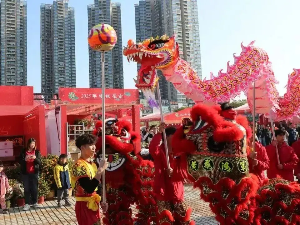 锣鼓声里,醒狮队踩着鼓点跳跃