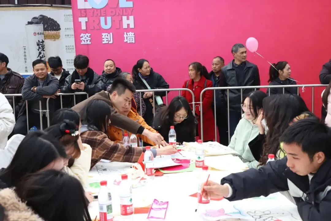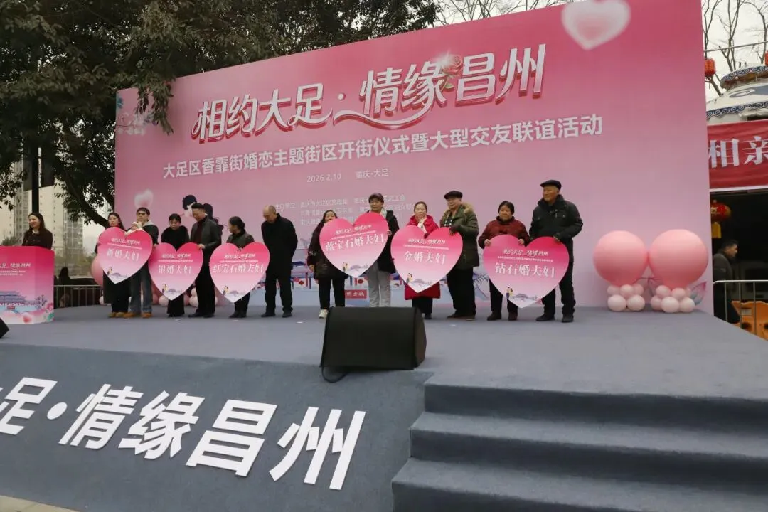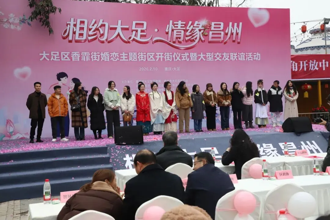 2月10日上午,大足区“香霏街婚恋主题街区”正式开街,举行首场“相约大足·情缘昌州”大型交友联谊活动。自此,大足市民及广大游客有了一个专门便于联谊交友、敢于说爱的浪漫之地,未来将有众多有缘人在这里相识、相知、相恋,发表他们的爱情宣言。