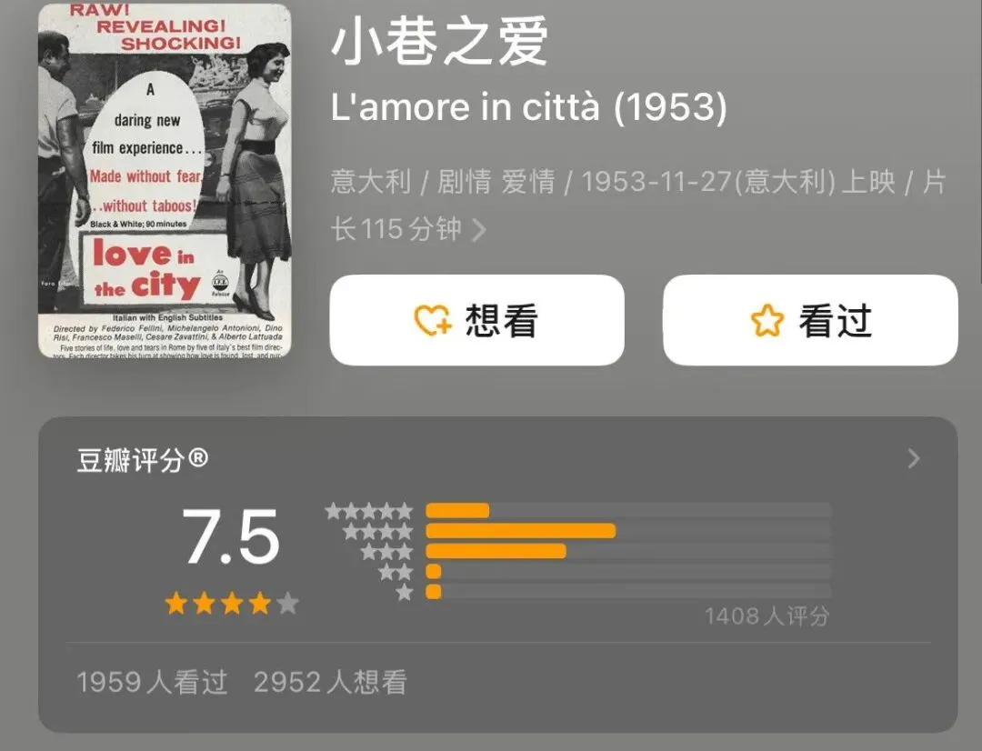 这部影片上映于1953年,由意大利编剧切萨罗·扎瓦蒂尼发起,以都市爱情作为主题,由安东尼奥尼,费里尼,迪诺·里西等 七位导演联合制作。整部影片体现着浓厚的新现实主义色彩。