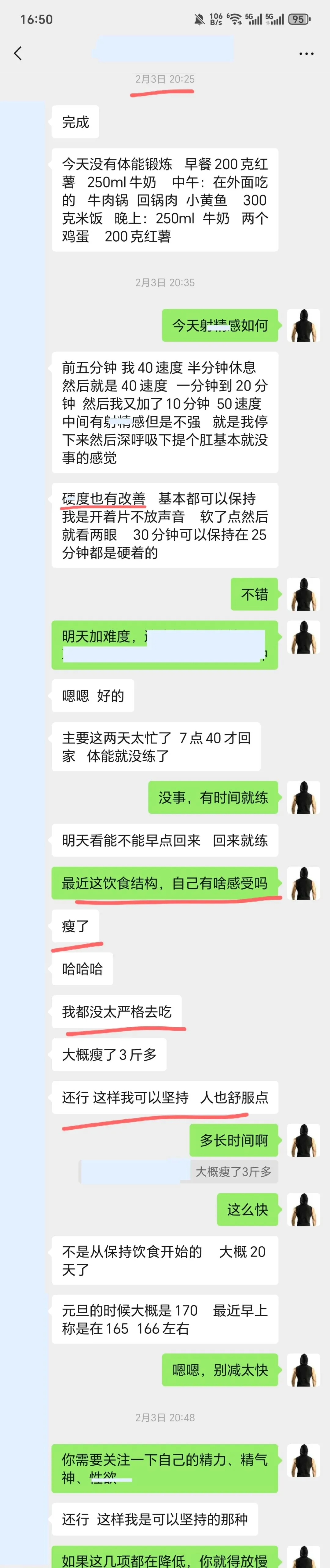 2025 年 12 月 30 号报名成为学员,大概情况:29 岁,刚谈恋爱,和女朋友有过几次简单的尝试,都比较失败,隔着衣服蹭 2 分钟的水平;2019年和前女友可以 20 分钟,当时用手出不来,这几年手艺活比较多,一味追求快,现在用手 3-4 分钟;硬度和身体素质也不太行,有十几年的手淫史,体重大,生活习惯不健康;针对硬度和身体,给学员调整了饮食和运动方案,后面硬度和身体也有提升,下文会提到。下面附上长截图,该图片可以上下滑动二、训练后的实战