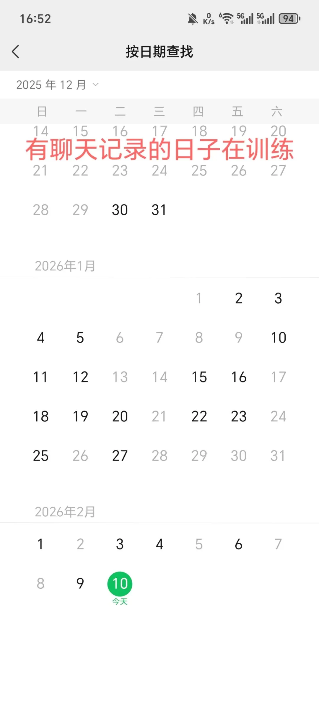 要求学员每次训练结束,都来向我反馈,下方有聊天记录的日子,该学员都有训练,主要集中在 1 月。具体情况如下图,该图片可以上下滑动四、训练水平