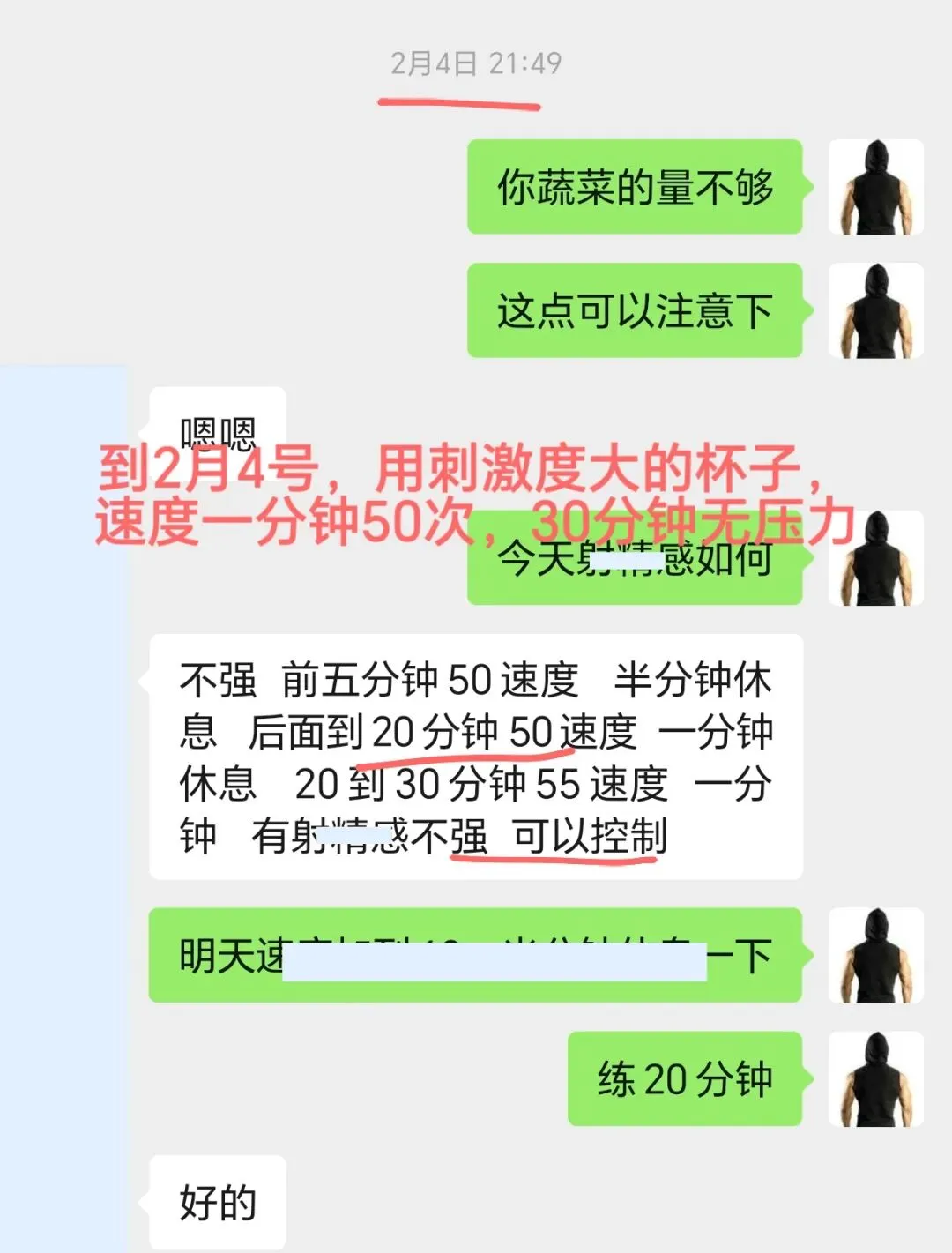 本文的主人公刚谈恋爱,跟女朋友简单尝试过几次,比较失败,隔着衣服蹭大概 2 分钟的水平,训练 1 个月,最近实战 42 分钟没发射,学员属于有天赋,训练进步非常快。