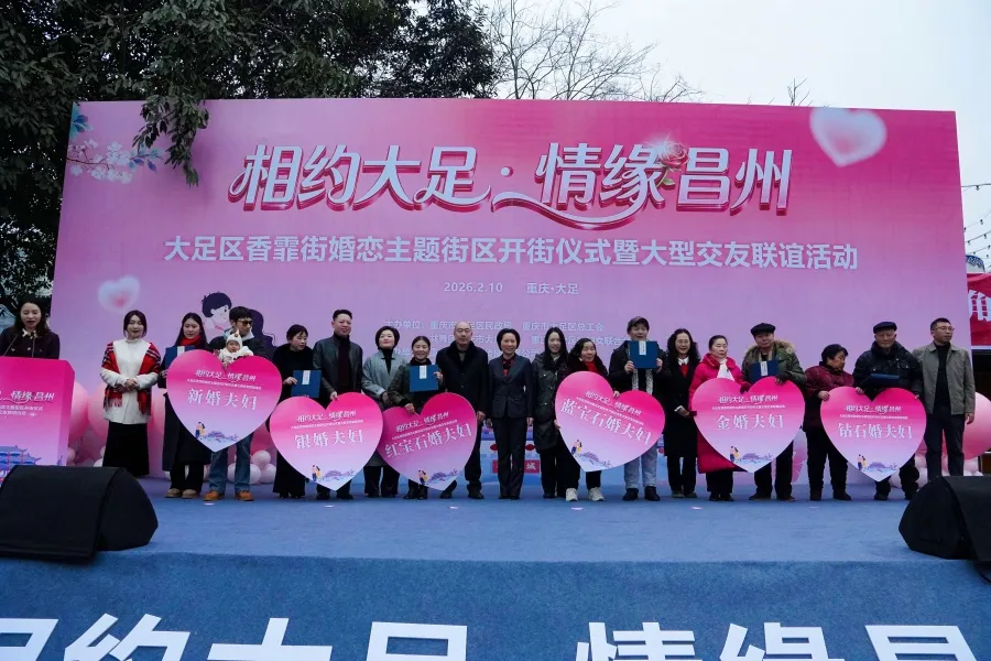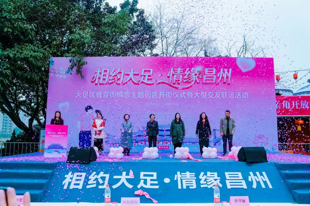 为深入贯彻服务民生决策部署,助力建设婚育友好型城市,发挥全国婚俗改革实验区示范作用。2月10日上午,大足区香霏街婚恋主题街区开街仪式暨大型交友联谊活动温情举行。活动由区政协统筹,区妇联牵头联合区民政局、区总工会、团区委等单位主办,以“相约大足·情缘昌州”为主题,让千年石刻文化与现代婚恋新风深度交融。