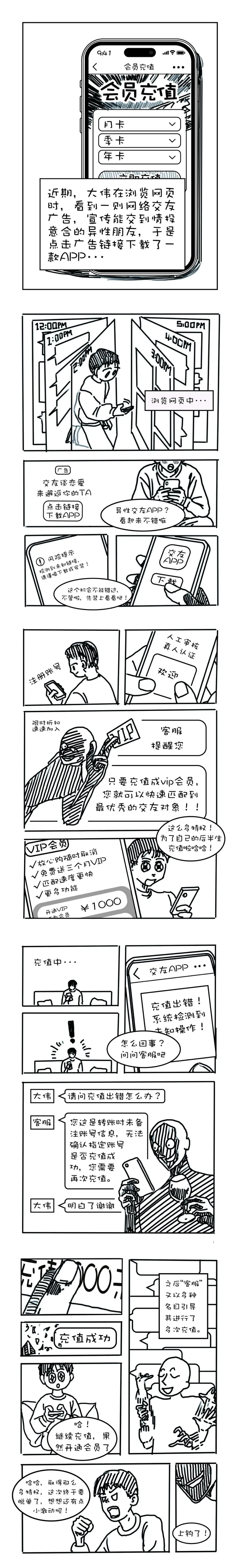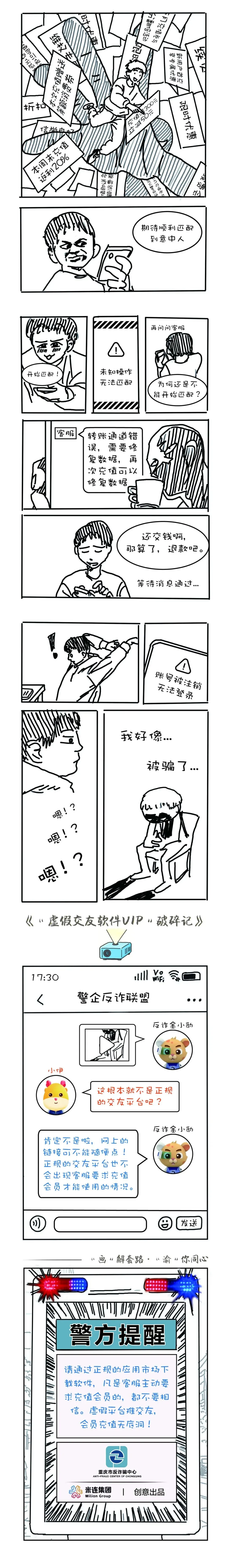 为了切实筑牢平台反诈防线,近日米连集团联合重庆市反诈骗中心精心创作了《“画”解套路 · “渝”你同心》反诈主题系列漫画。该系列漫画共六篇,依托重庆市公安局在案件数据、诈骗手法研究上的专业优势,结合米连集团对用户行为习惯的深刻洞察,聚焦社交行业高发的诈骗类型,以 “漫画故事 + 文字解析 + 防诈要点” 的形式,生动还原诈骗分子的作案流程与话术陷阱,精准戳中诈骗团伙的核心套路,让原本专业晦涩的反诈知识变得通俗易懂,尝试为广大平台用户开辟一条生动有趣的反诈学习新渠道。2026新年伊始,该系列漫画会在“重庆刑侦”和平台官号上线推出,即日起每周一篇,敬请关注。助您学知识、防诈骗,理性交友、守护好个人财产!
