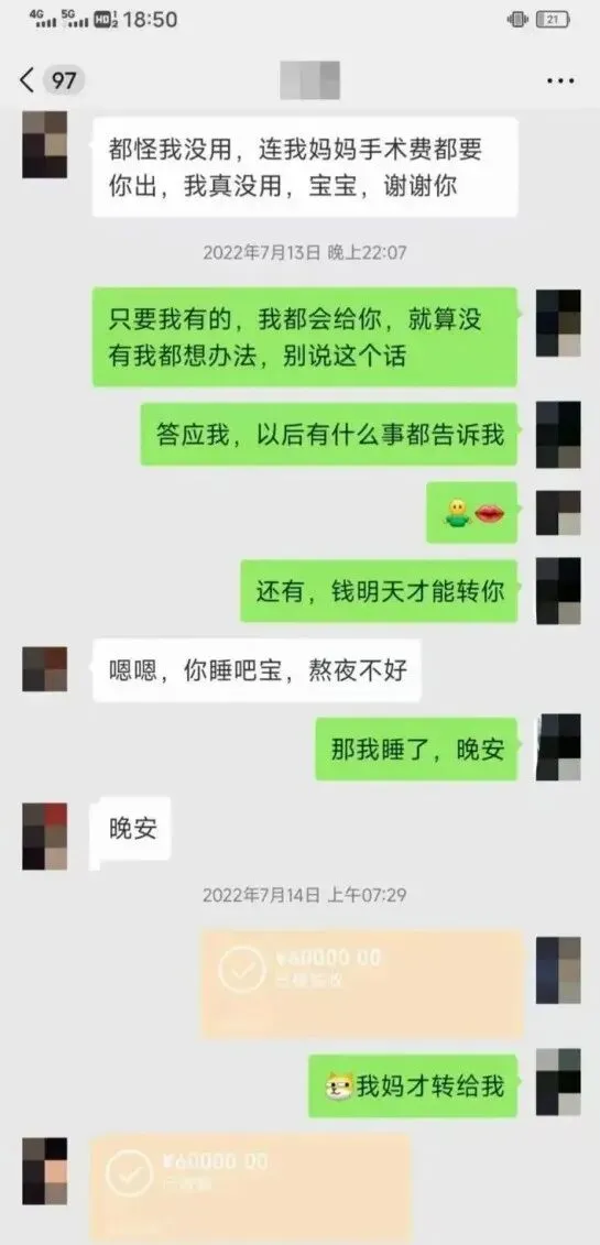后来我心疼他,承诺帮他出学费,不用再打工,还经常给他买大牌衣服鞋子。看他越穿越光鲜,朋友羡慕,我也时不时转两三千给他零用,说“别委屈自己,我兜底”。他虚荣心得逞,对我更上心了。三年里我从不算转了多少钱,每月不定期转,刚开始小额,最多不超过8000。直到有天晚上,他愁容满面唉声叹气,说外婆脑溢血摔倒,急需手术,亲戚只借到一万五,还差四万。他说不想让我烦恼,开不了口。我傻乎乎觉得他“有尊严”,马上给妈妈打电话,说看中一款LV包要四万多,快生日了当礼物,让妈妈转五万。挂了电话我原封不动转给他,说剩下一万给外婆买营养品,叮嘱他快给妈妈转钱手术,还“严肃”说以后有事必须告诉我,一起承担。