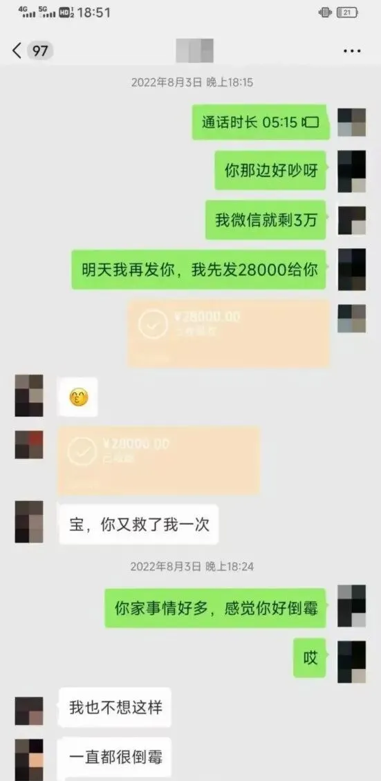 从那以后,我给他的大额转账越来越多:三次,最少六万,最多十四万。一次是他妈妈扫地被车撞断脚,肇事司机逃逸,手术费七万;一次是妈妈后续康复六万;还有一次是他堂姐买房首付差十四万。他说堂姐被家暴离婚净身出户,知道他找了个有钱女朋友,想通过他借,他不想在堂姐面前丢面子。这话精准踩在我“爱面子”的点上,我想起自己说过“有事一起扛”,恋爱脑上头,立刻转了钱。他还说“我们是要结婚的,你给我的钱相当于老婆给老公花,天经地义”,堂姐要写借条,我断然拒绝:“一家人不说两家话!”他冲过来猛亲我,我觉得花钱买他开心、让他更爱我,值!