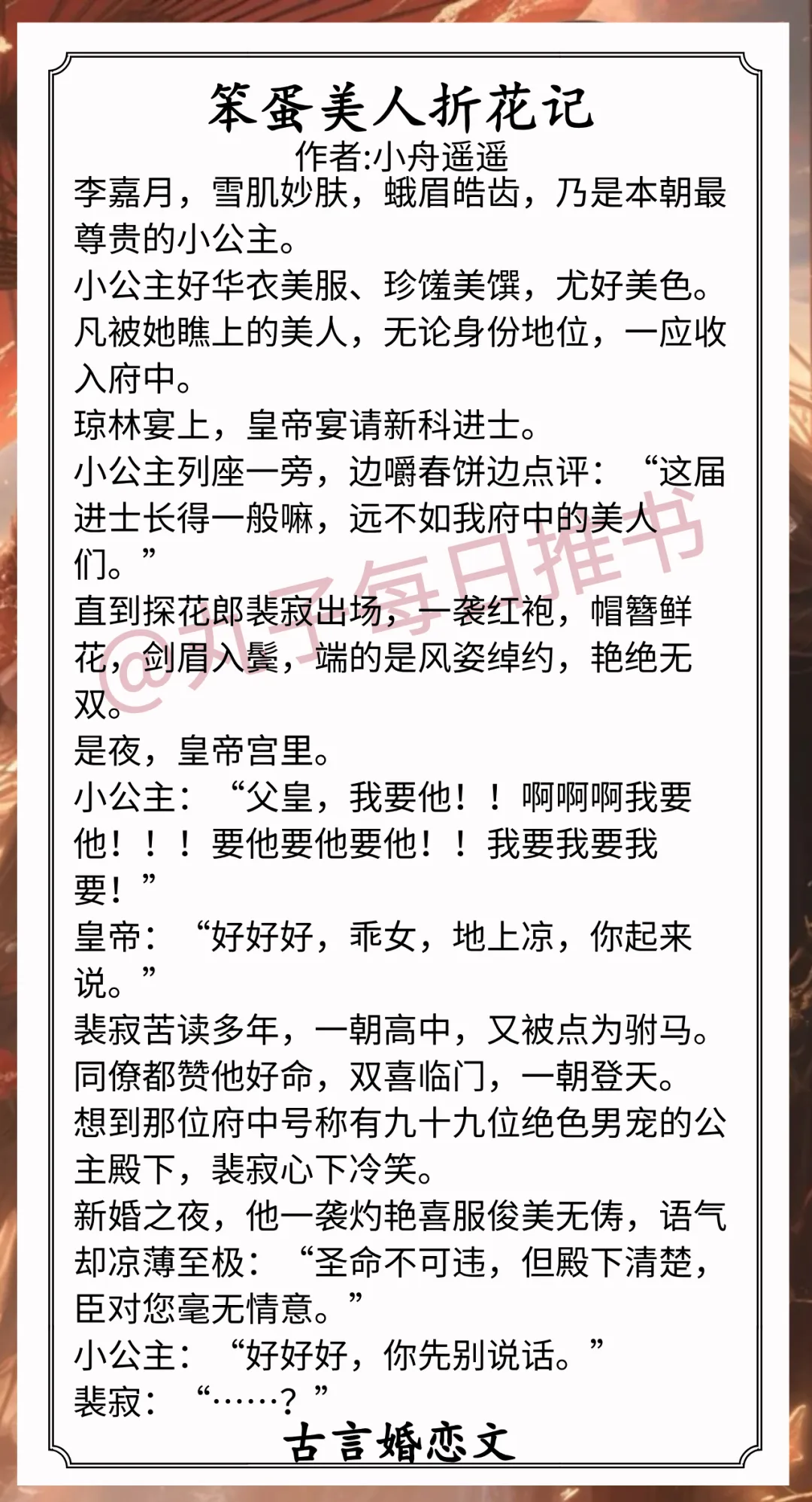 1.《笨蛋美人折花记》作者:小舟遥遥(单纯颜控小公主vs清贵古板探花郎,见色起意,女强夺男,先婚后爱)