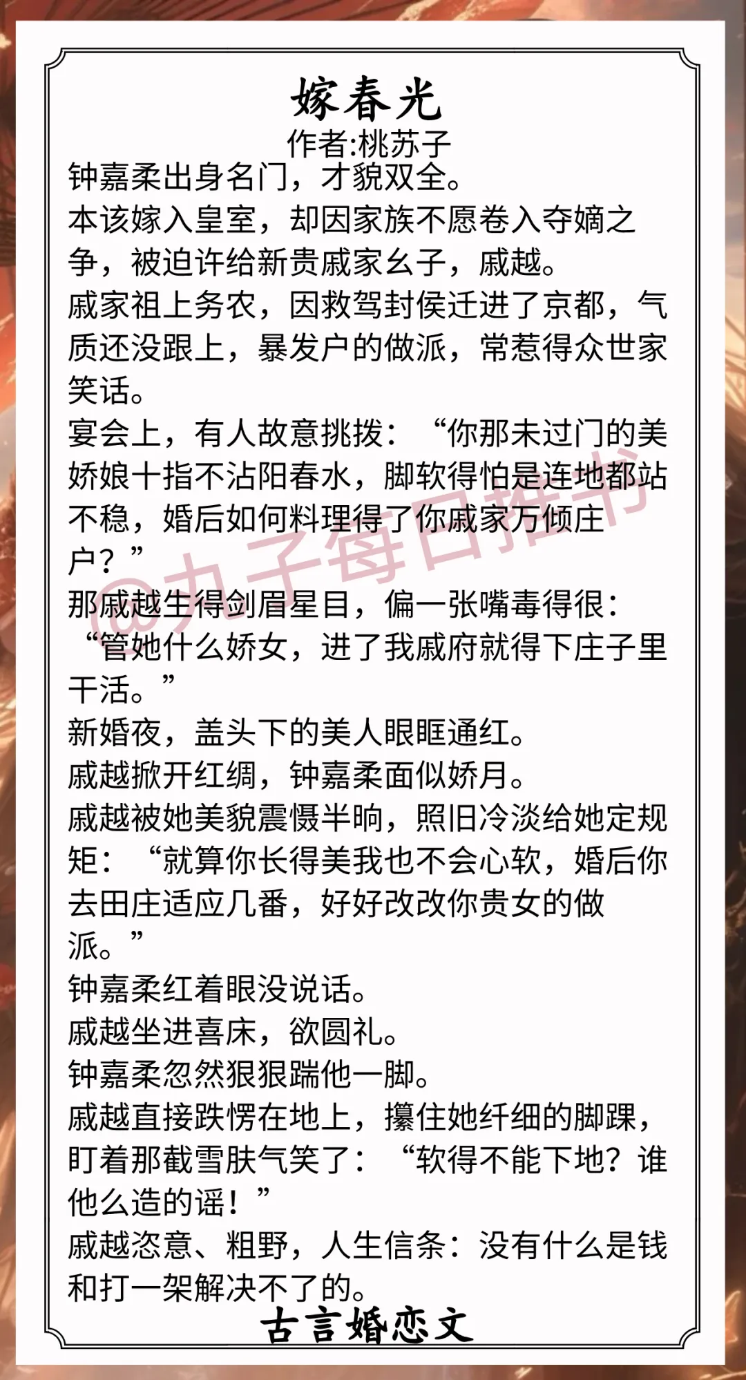 2.《嫁春光》作者:桃苏子(娇气贵女vs忠犬泥腿子,少男少女,先婚后爱,真香甜宠文)