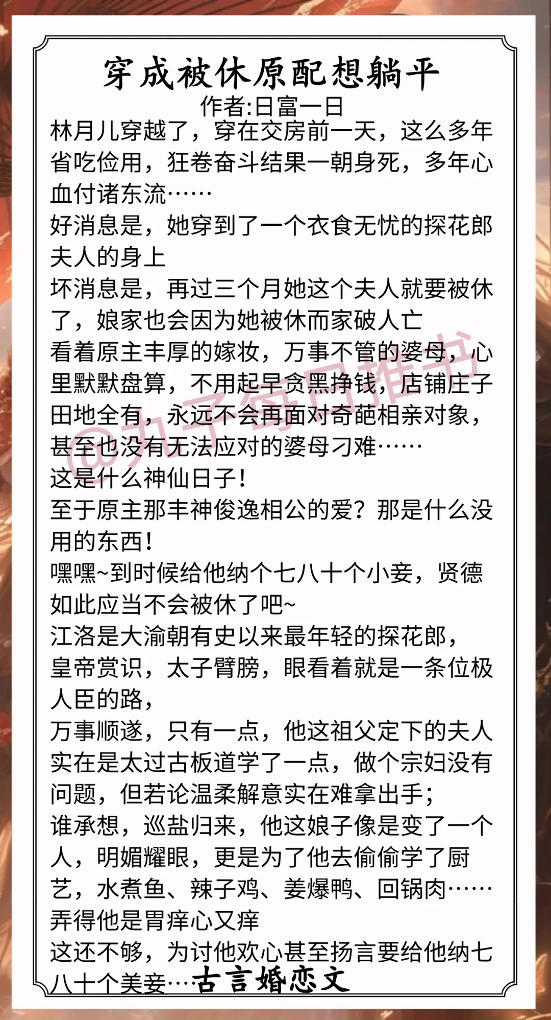 3.《穿成被休原配想躺平》作者:日富一日(咸鱼乐观美人vs宠妻温柔权臣,穿越,美食日常,先婚后爱,温馨鸡飞狗跳生活)