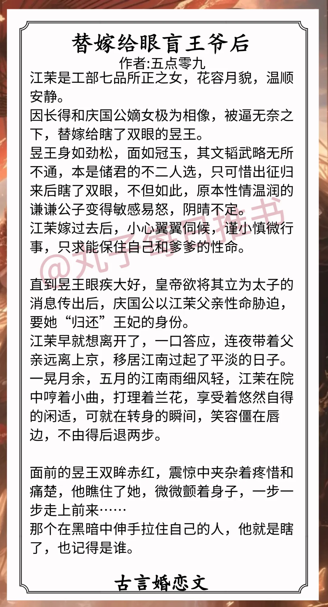 4.《替嫁给眼盲王爷后》作者:五点零九(温婉美人vs俊美王爷,替嫁,先婚后爱,追妻现场)