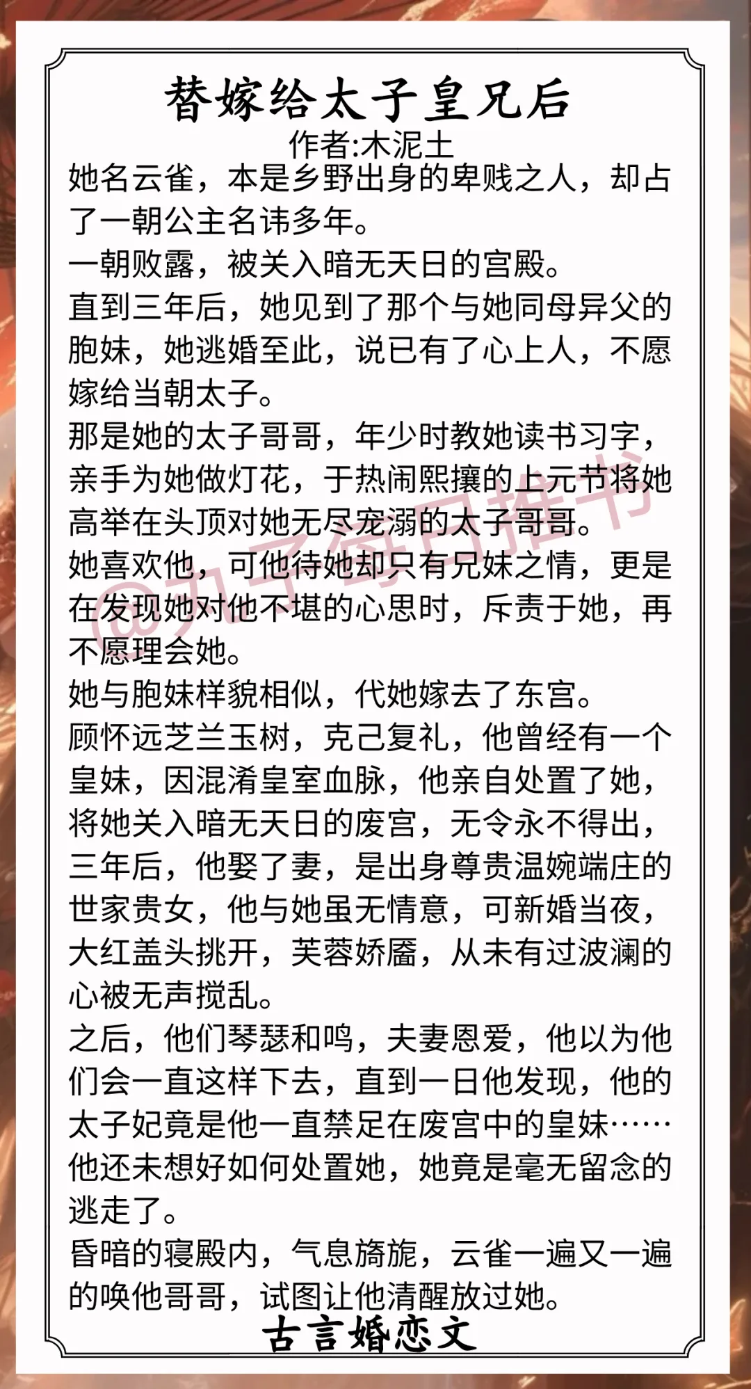 5.《替嫁给太子皇兄后》作者:木泥土(戏精胆大皇妹vs冷静克制皇兄,伪骨科,替嫁,追妻火葬场)