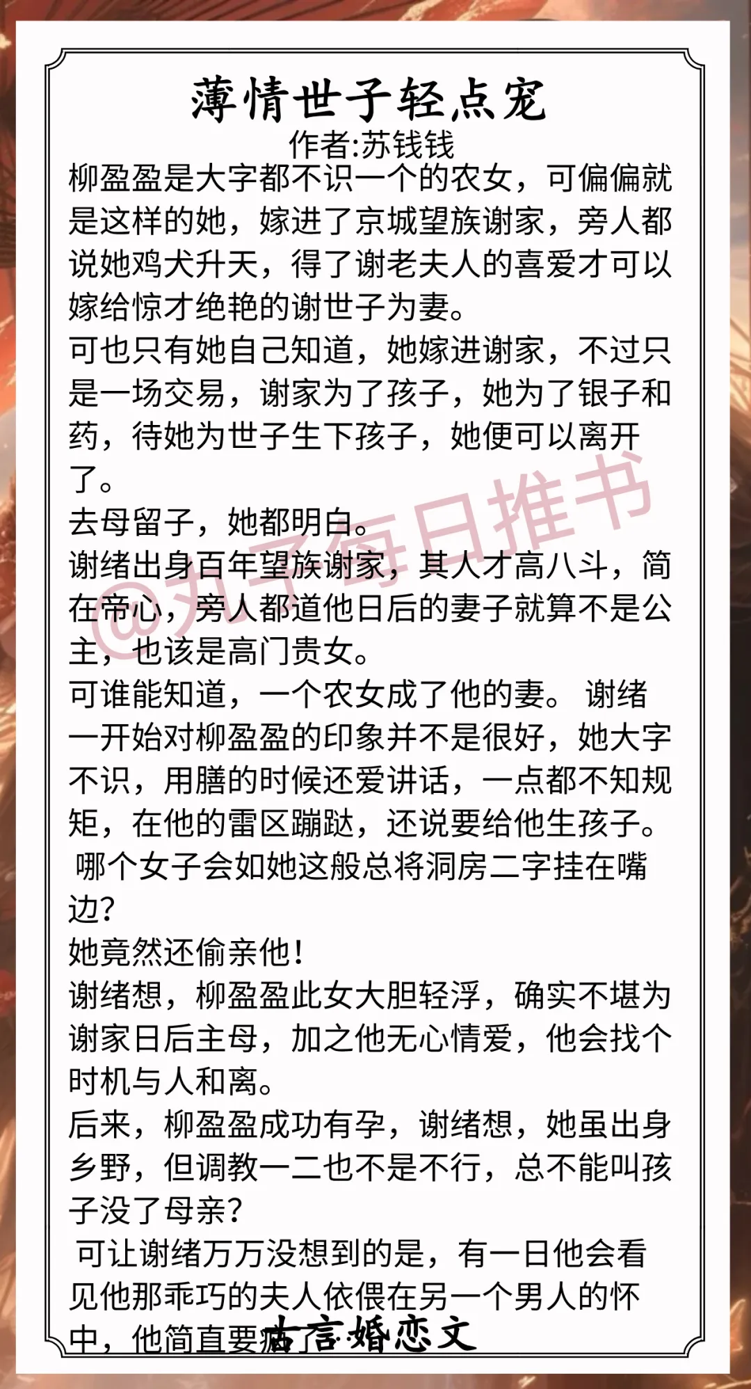 8.《薄情世子轻点宠》作者:苏钱钱(娇憨小农女vs高冷世子爷,先婚后爱,打脸真香,发疯强制爱)