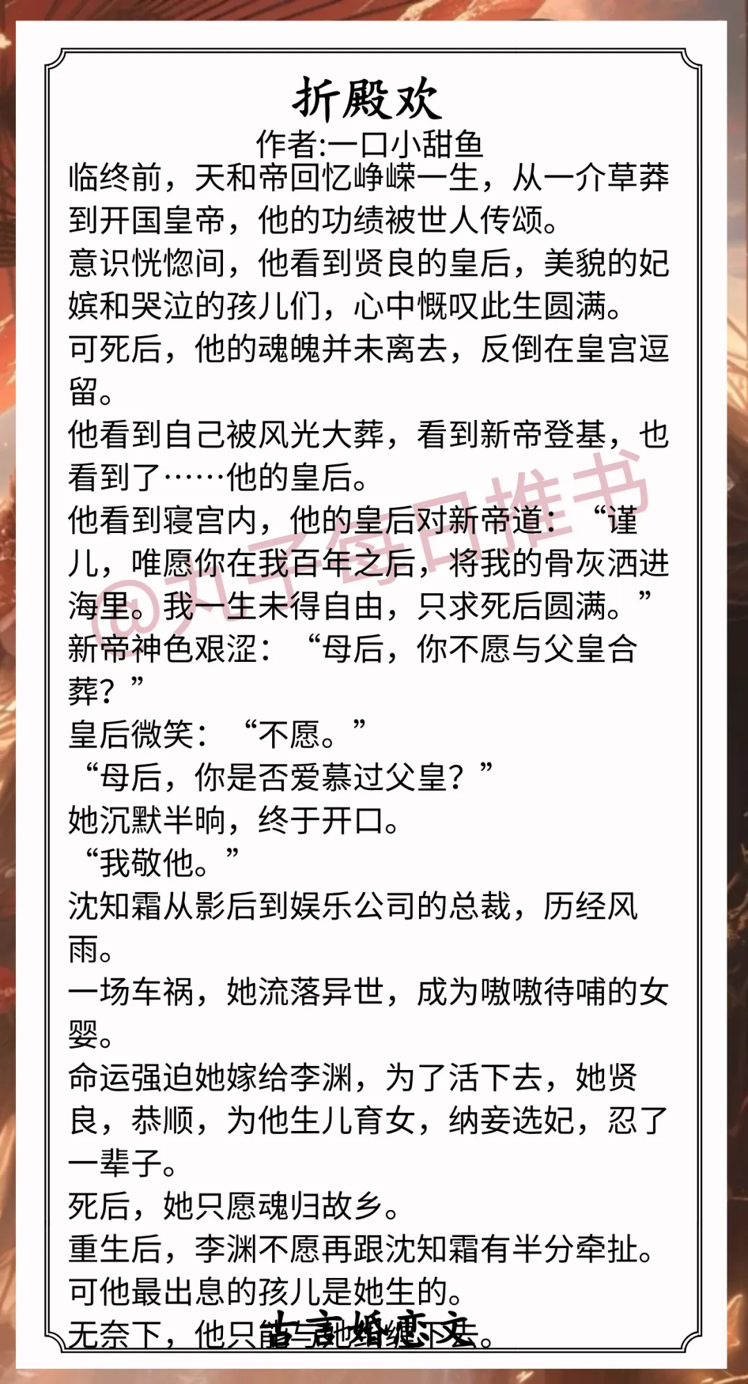 9.《折殿欢》作者:一口小甜鱼(清醒穿越皇后vs重生高冷皇帝,婚恋,追妻火葬场)