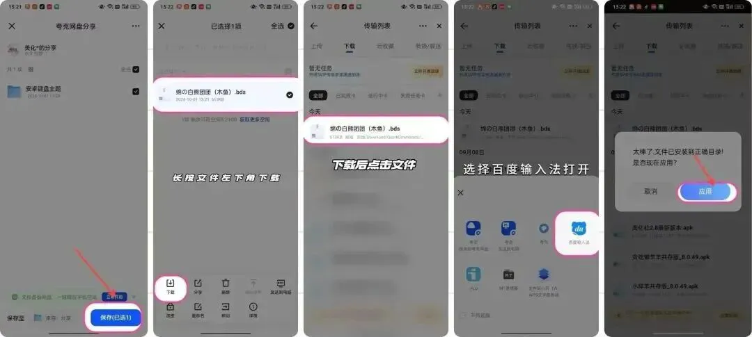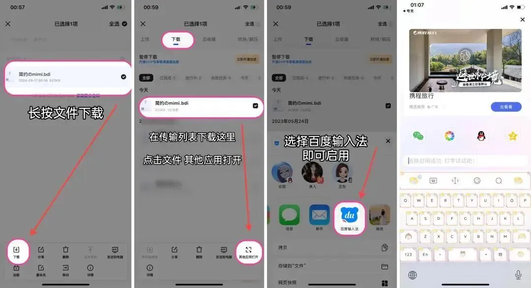 3.在下载管理处点击刚刚下载好的皮肤文件,点击其他应用打开,选择百度输入法打开,皮肤就安装好了。