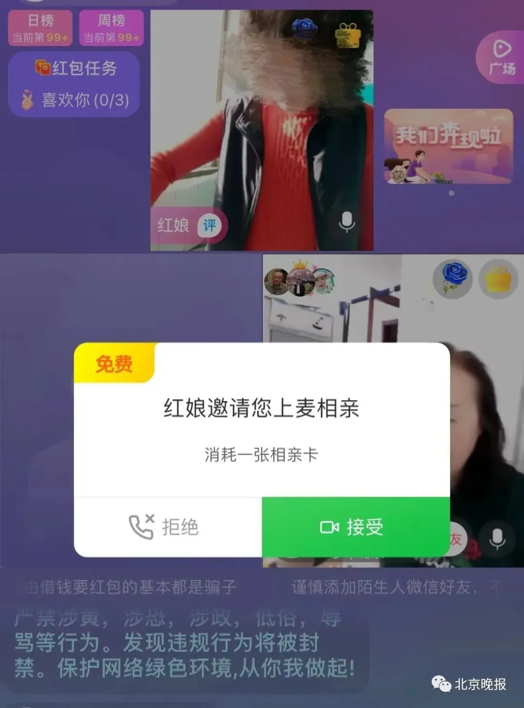 “欢迎小灰灰!”见有异性进入,红娘迅速发来一张“连麦卡”,邀请记者进入直播间。记者点击拒绝后,她便继续招徕其他围观者,