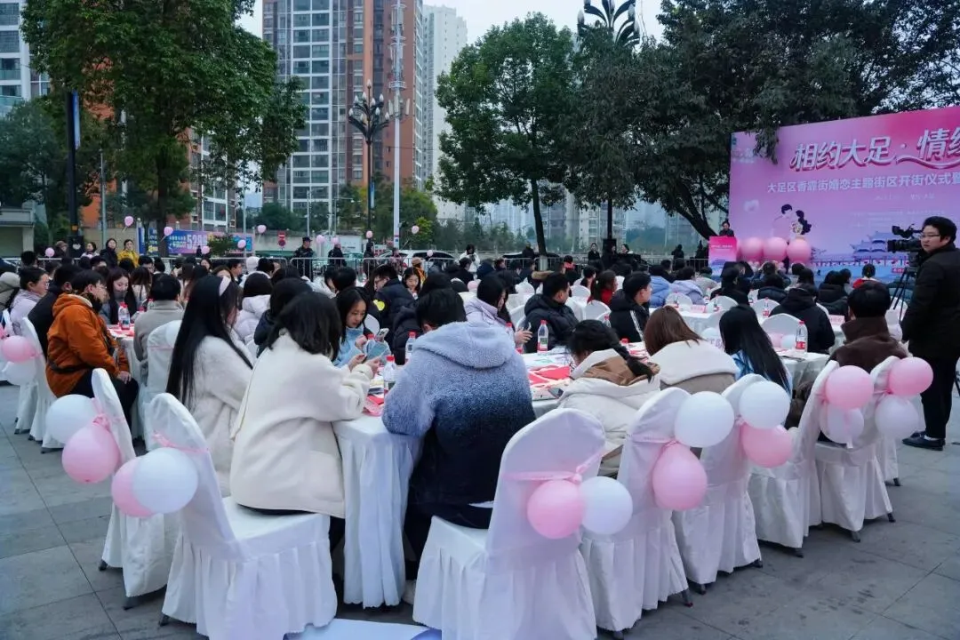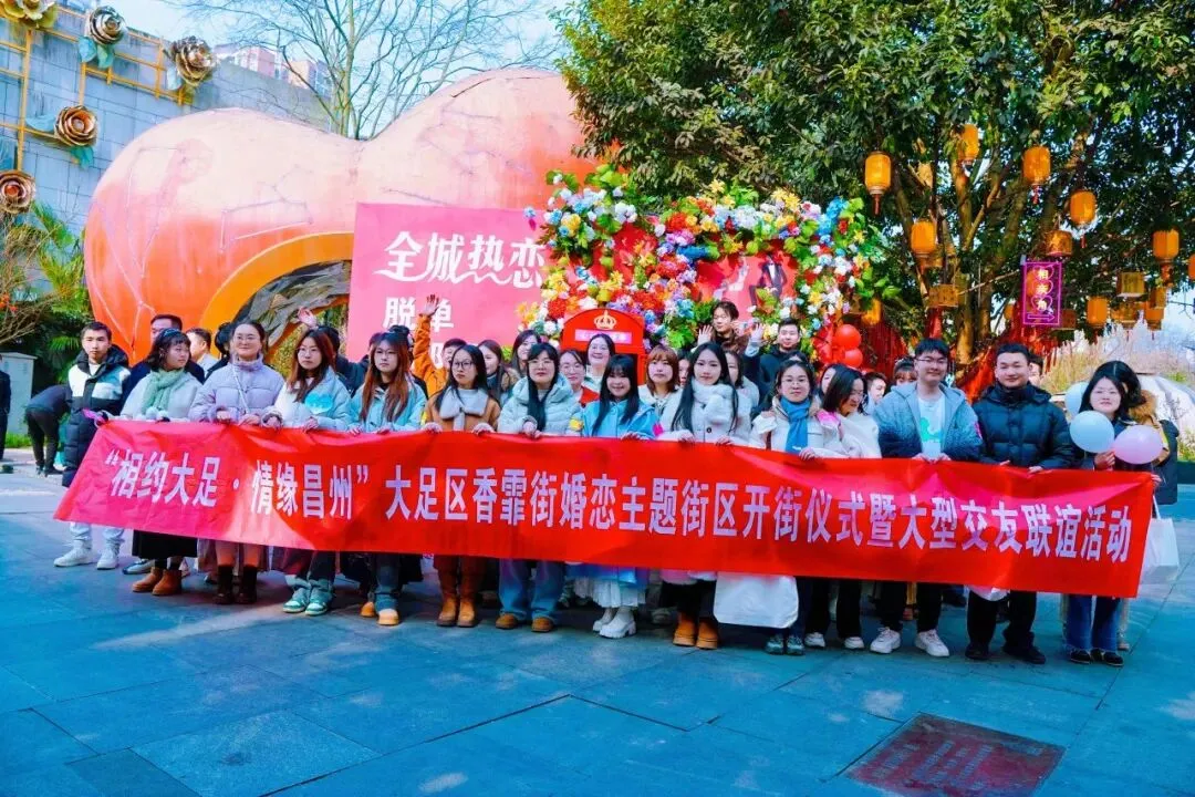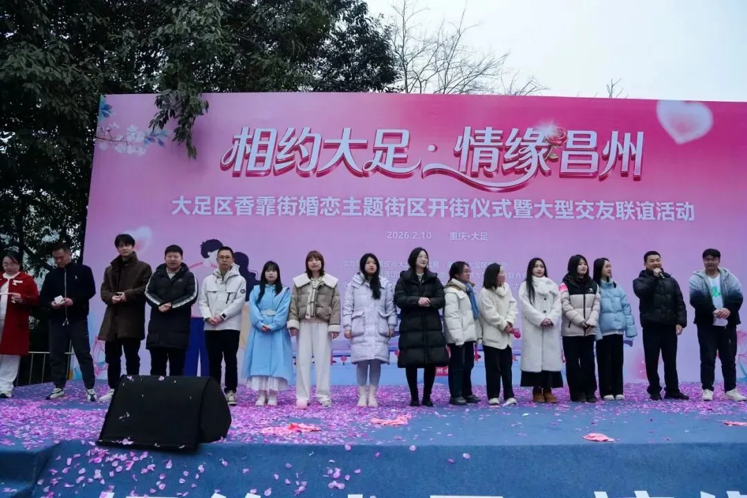 春潮涌动,爱意满街。2月10日上午,重庆市大足区昌州古城香霏街锣鼓喧天、喜气洋洋,全区首个婚恋主题街区正式开街,首场“相约大足・情缘昌州”大型交友联谊活动同步启幕。60余名单身青年欢聚一堂,在浪漫氛围中相识相知、勇敢寻爱,而这温馨一幕的背后,是大足区政协聚焦青年婚恋难题、积极履职尽责的生动实践,更是大足深耕全国婚俗改革实验区建设又一重要举措。