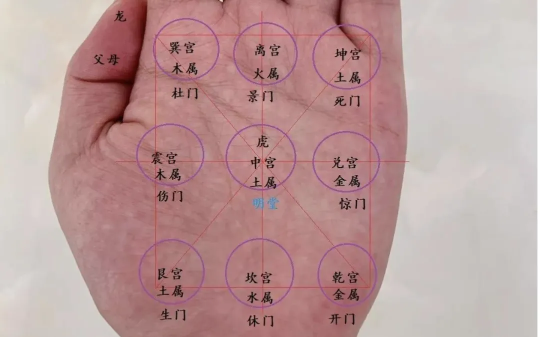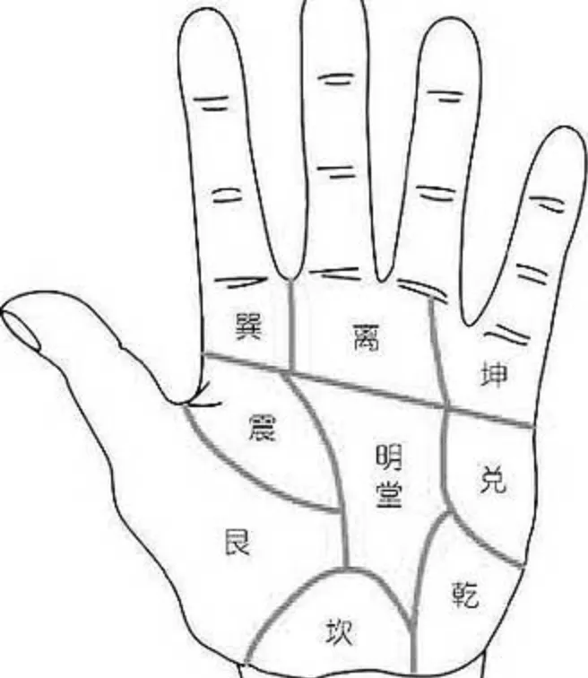 手掌的八卦宫位,以中央明堂为核心,周围环绕乾、坎、艮、震、巽、离、坤、兑八宫。古人将震、兑、坎、离对应春夏秋冬四季,乾、艮、巽、坤比作四方之门,讲究 “四时调和、四体端正”,这放在婚恋里,就是他的人生状态 “平衡有序”,没有极端的短板。二、核心筛查:6 个关键宫位,决定婚姻的 “底色”