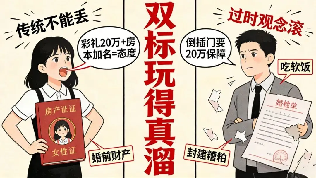 前几天刷到一个街头采访,问女生“愿不愿意在房产证上加上另一半的名字”,99.99%的女生都果断拒绝,嘴里还念叨着“这是我的婚前财产,凭什么加他的名字”。结果转头就有个男生,在相亲角说自己愿意倒插门,只要女方给20万彩礼,给自己一个保障,瞬间就炸锅了,一堆人跳出来PUA他“吃软饭”“没骨气”。