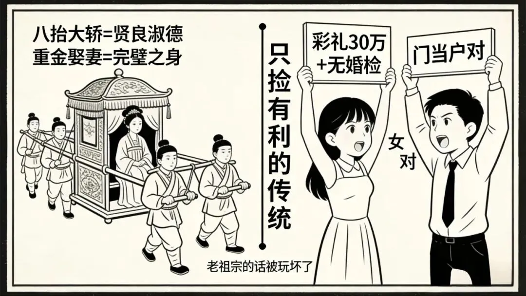 拜托,要讲传统就讲到底啊!古时候八抬大轿,抬的是贤良淑德;重金娶妻,娶的是完璧之身;三媒六聘,聘的是知书达理。现在只捡对自己有利的传统讲,不利的就全盘否定,哪有这样的道理?