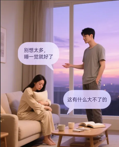 你分享一天的疲惫,他回应说:“别想太多,睡一觉就好了。”