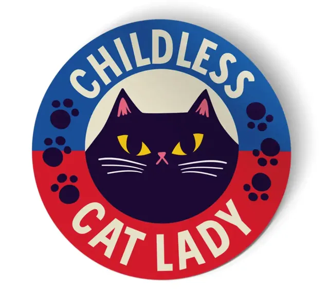 2024年美国大选,现任美国副总统万斯(J.D.Vance)公然污名化未婚女性为“无孩爱猫女”,声称她们歇斯底里、报复社会。但后者对这一词汇重新诠释以反击。图为一枚她们的徽章
