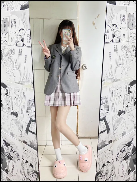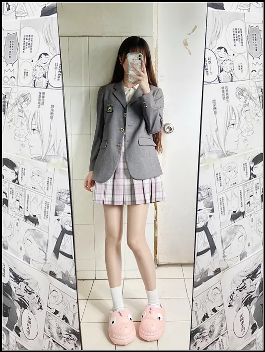 灰色西装外套搭配粉系格裙,简直就是校园少女感拉满有没有!再来一双呆萌厚底拖鞋,元气满满,减龄又可爱,日常出街也能轻松slay!