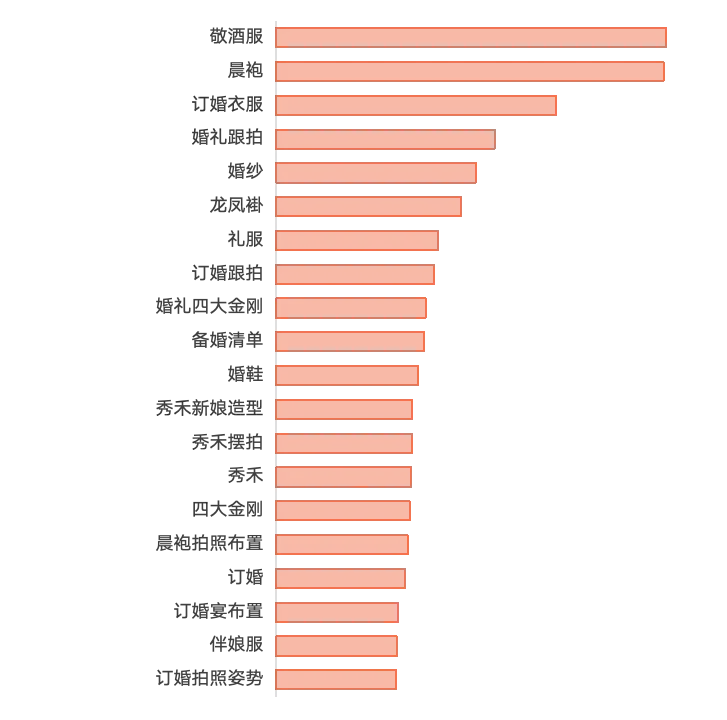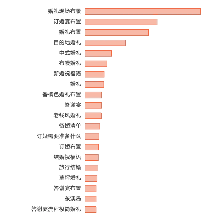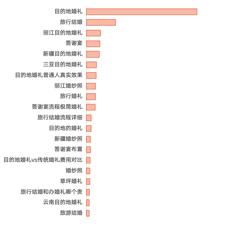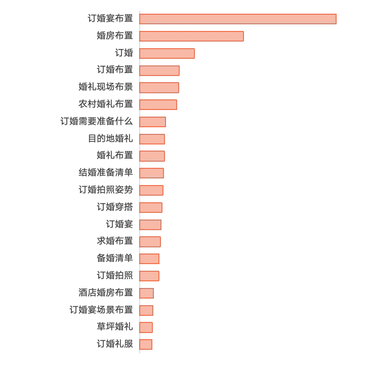 婚礼周边热搜词:用户在搜索具体的方案,如品类词、业务词、风格词。