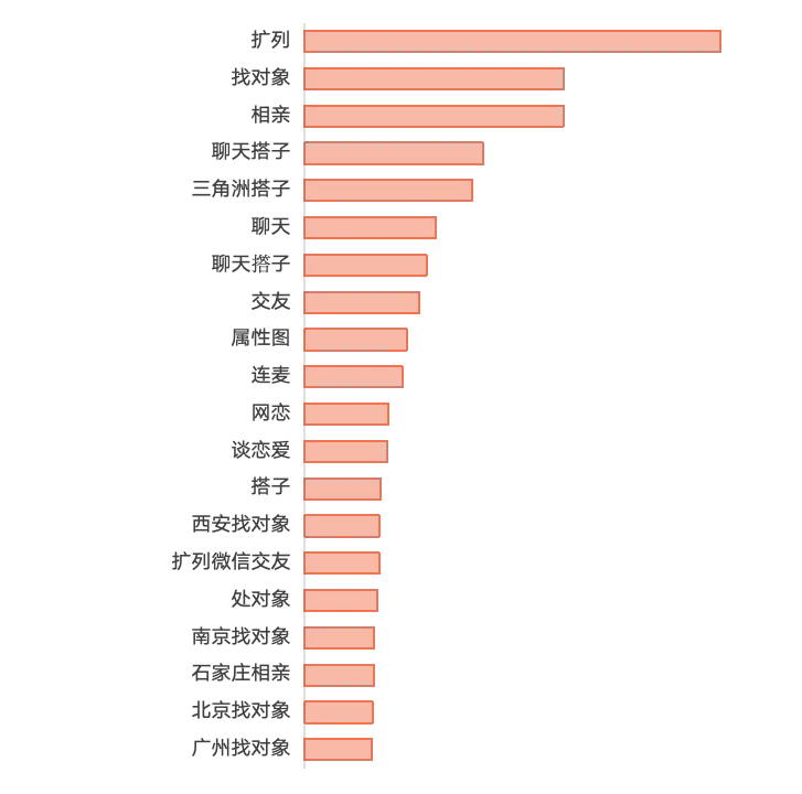 婚恋交友热搜词:用户搜索关注点是在于区域和本地的交友扩圈,同时也关注线上交友路径。