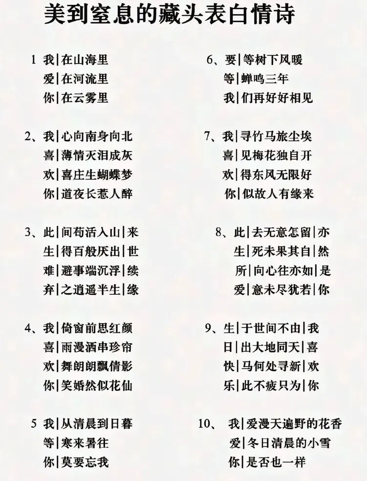 像这种藏字诗啊,方程式表白啊等等的那种,都是高智商,有文化底蕴的人,基本都是脑子清醒,比较理智,谈恋爱能过肾,不走心的。