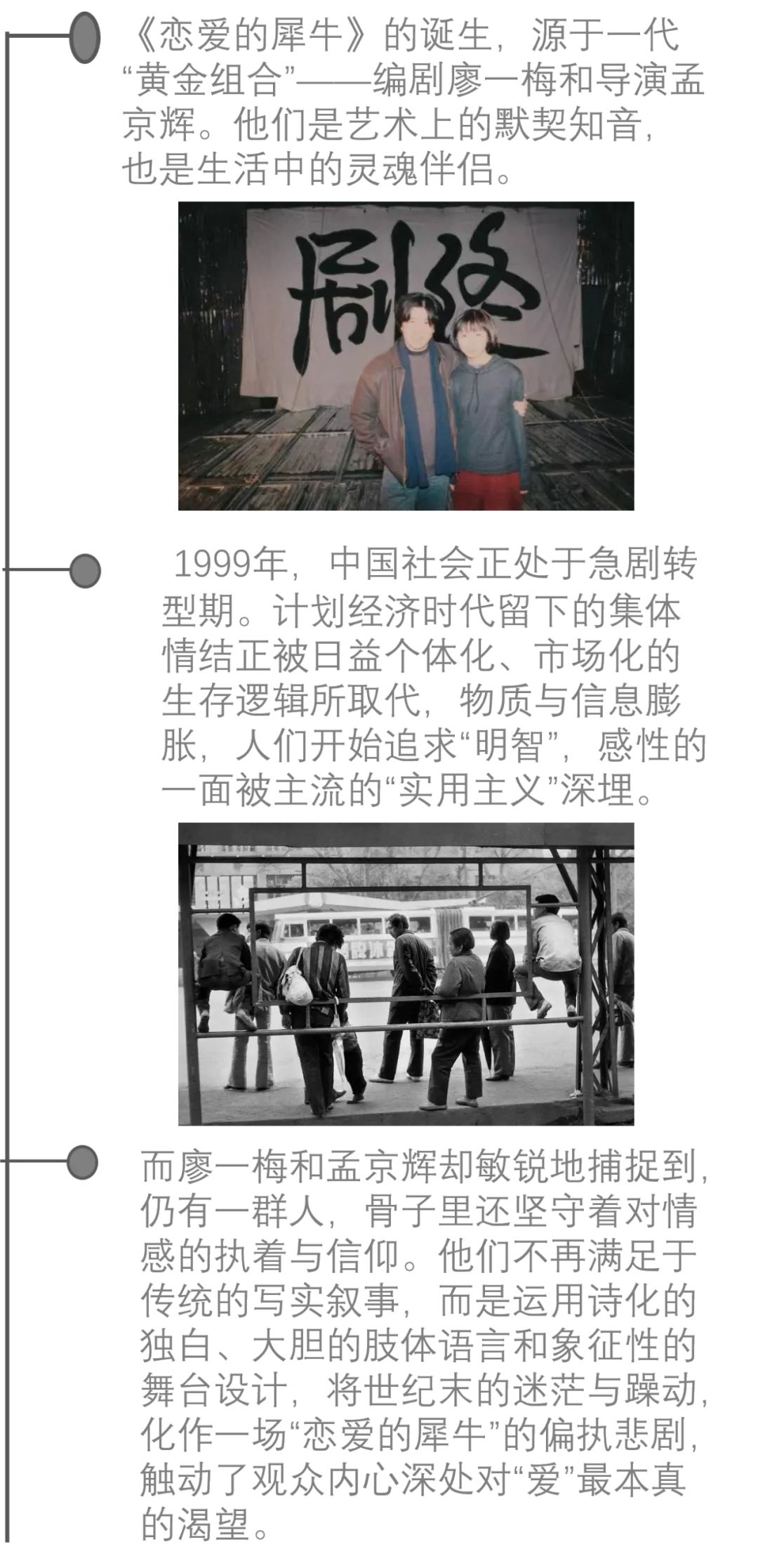 《恋爱的犀牛》以其诗化的独白、大胆的肢体语言和象征性的舞台设计,在世纪末的实用主义浪潮中,敏锐地捕捉并戏剧化了一部分人对“非功利爱情”的幻想与挣扎。它向观众抛出关于爱的诘问,而并没有提供答案,从而让我们学会审视爱情中理性与疯狂的边界。