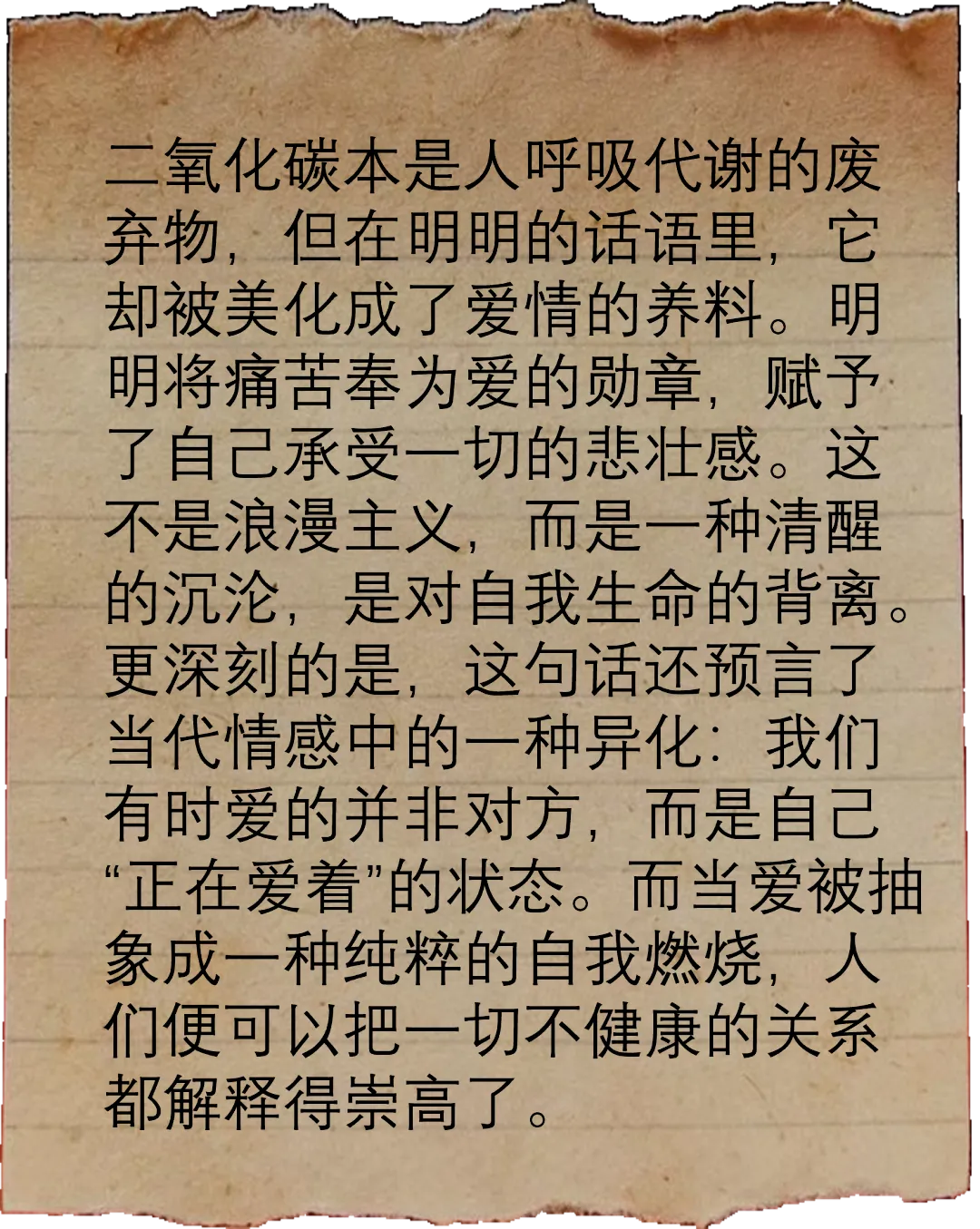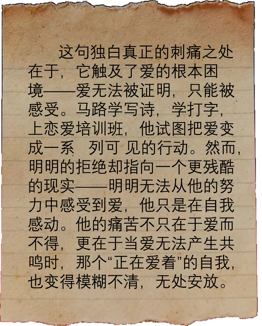 但放到现在来思考,它仍有着一定局限性。它将痛苦视为真爱的证明,忽视了健康关系中的理解、沟通与相互成全,这可能在无形中推崇了一种自我燃烧式的错误爱情观。同时,马路与明明被简化为“偏执”与“欲望”的符号,在一定程度上缺乏了人物的血肉真实感。尤其是明明的形象,始终处于男性视角的凝视之下,她的痛苦与执着更多服务于马路的情感叙事,而没有展现其作为女性独立的精神世界。