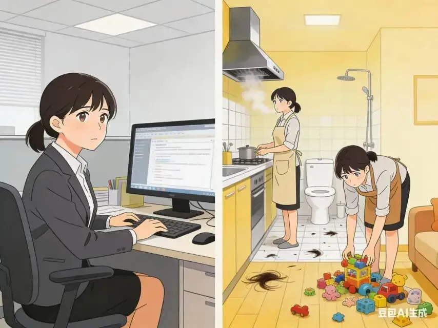 职场已经要求女性和男人一样拼,回到家却还要独自面对鸡毛蒜皮。厨房的油烟、卫生间的头发、永远收拾不完的玩具,这些细碎的消耗,日复一日啃噬着耐心。当两个人过成了一个人的独角戏,这第二笔账,也算不平。