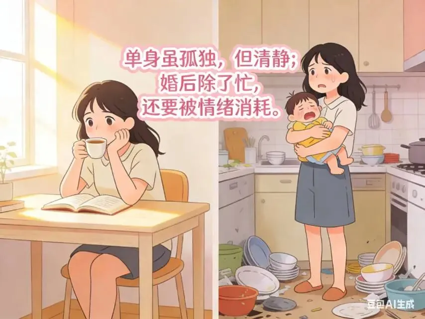 越来越多女性发现,单身时虽然孤独,但清静。结婚后,除了忙,还要处理夫妻矛盾、婆媳关系、育儿分歧。男人的沉默、回避、讲大道理,日复一日消耗着女人的情绪储备。