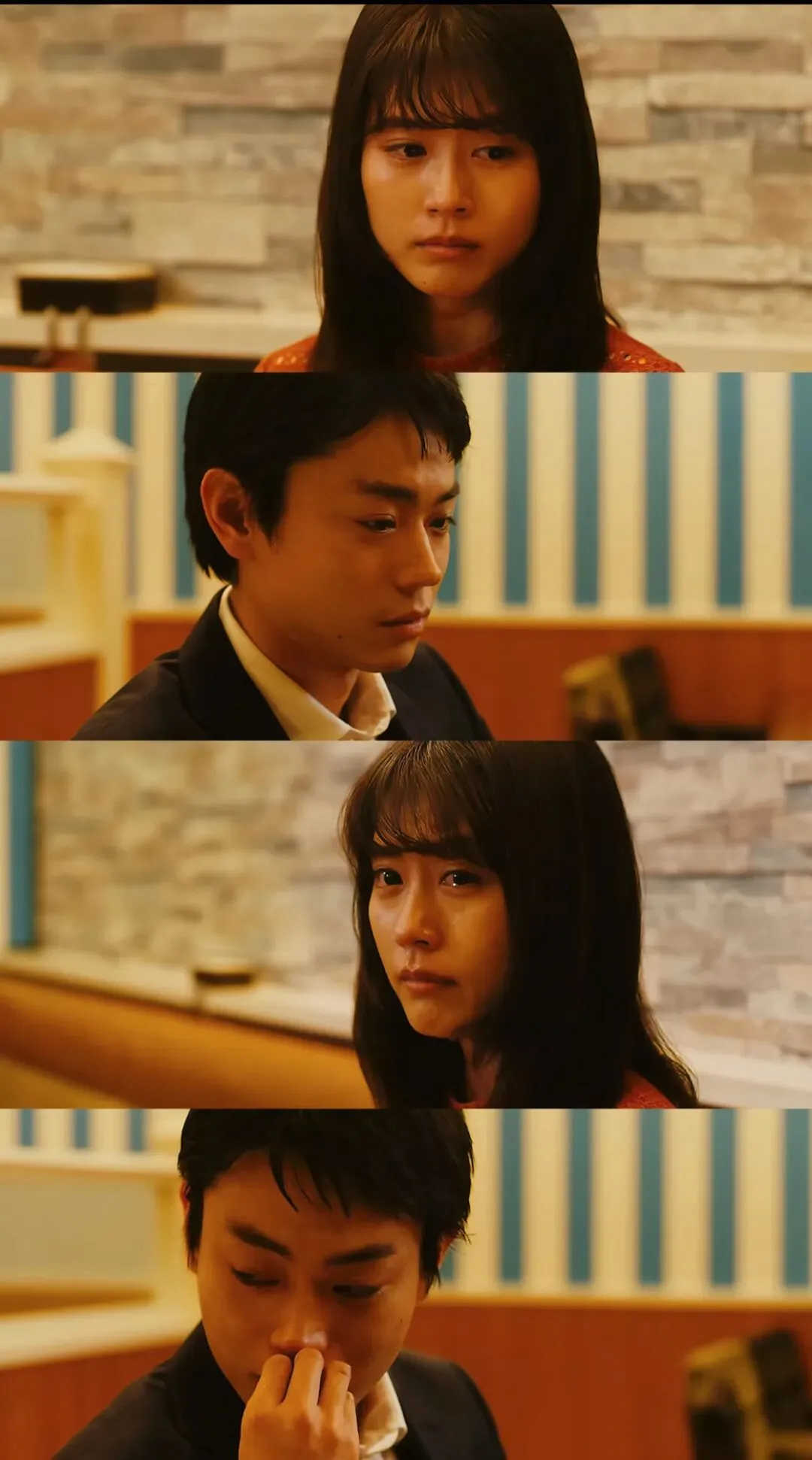 在分手的那个夜晚,他们来到了初识时的那家饭店,原先常坐的位置被人占用,只能够换到另一处去。一直到提出分手,他们都保留着体面,哪怕眼眶里已经盛上泪水;直到他们看到一对也许正处于暧昧的年轻男女来到他们常坐的座位,交换爱好,也倾诉着对彼此间的吸引——就像当时的他们,做着相同的事情——他们冲出去哭,在昏黄的路灯下拥抱,又唱了一宿的卡拉OK,再肩并肩走相同的路。