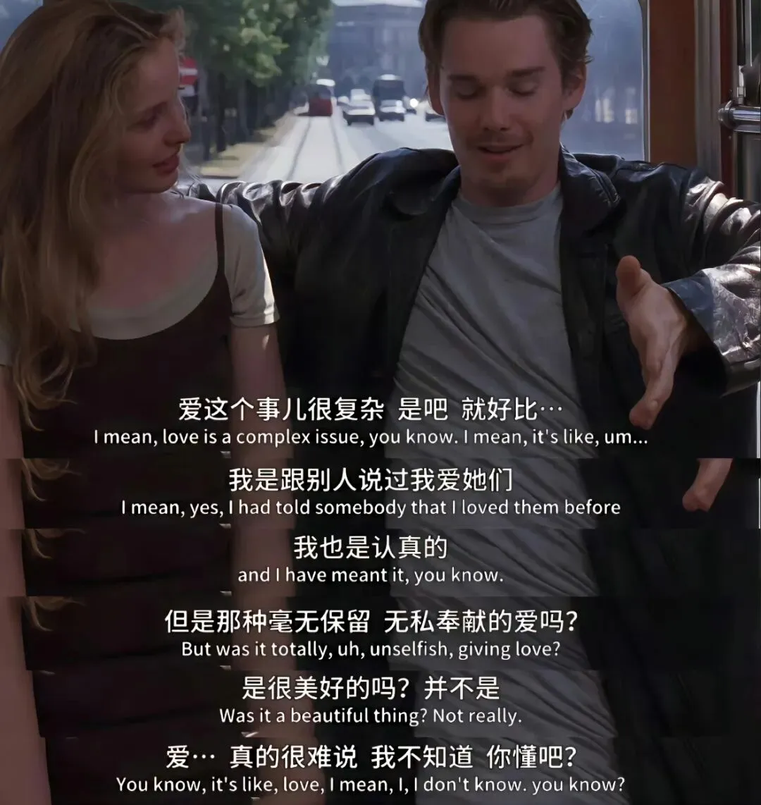 在今年一月初看《爱在》三部曲的时候,发觉第一二部(《爱在黎明破晓前》和《爱在日落黄昏时》)是最符合当下心境的,带有张力的莽撞的、未知的、轰轰烈烈的偶遇、相识、与再相逢;第三部所描绘的婚姻似乎过于真实,在显性的冲突与矛盾背后包含着诸多的隐忍与心酸,因而在直觉上并不被我喜欢!但后来又与舍友夜聊,才品到第三部。