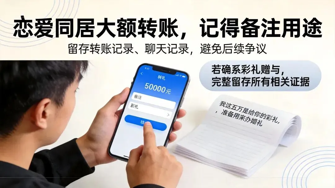 恋爱同居期间,大额转账建议备注用途(如“彩礼”),留存相关证据;若确系彩礼赠与,需保留转账记录、聊天记录等,避免后续争议。