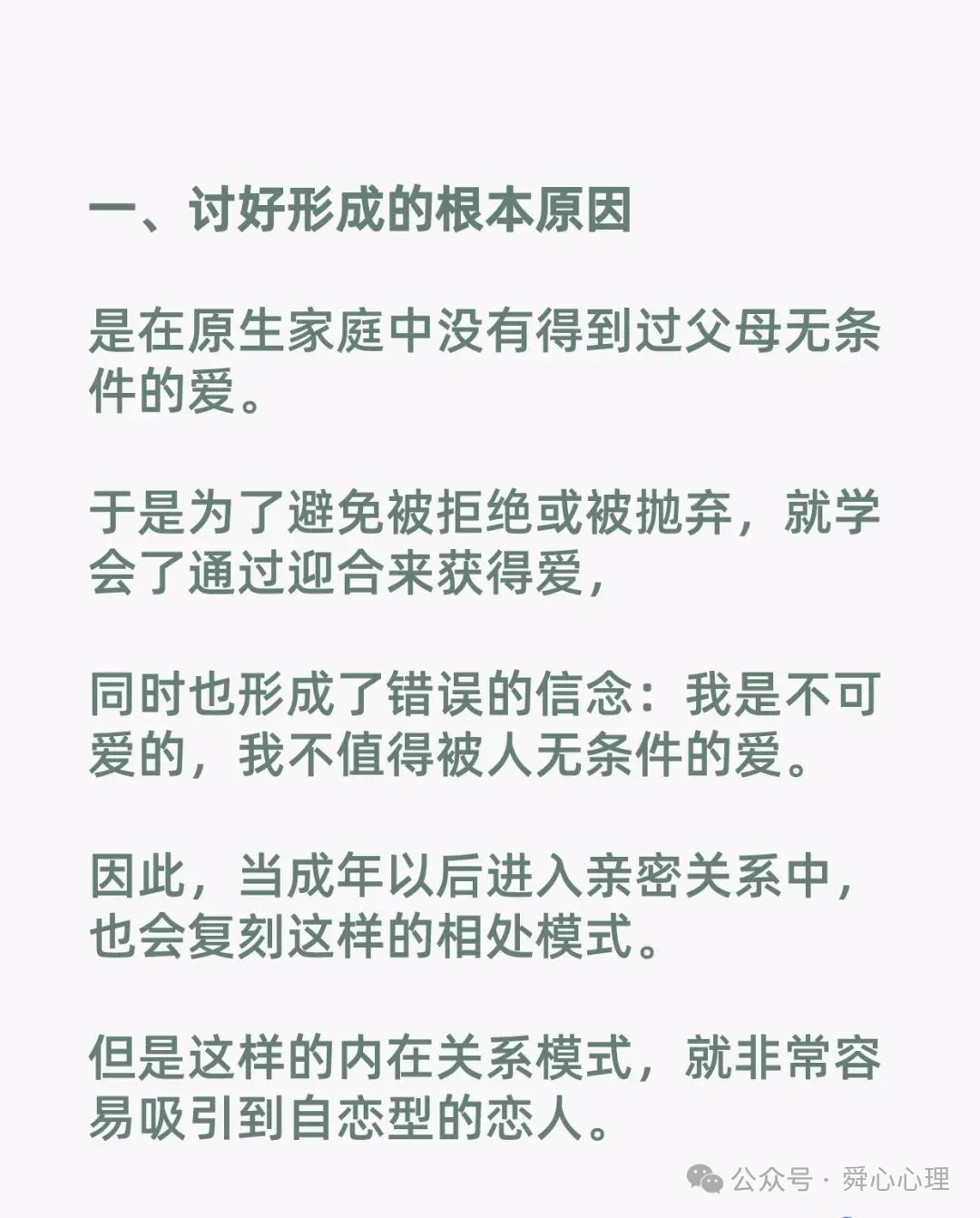 讨好型人格形成的根本原因,是在原生家庭中没有得到过父母'无条件的爱'"。