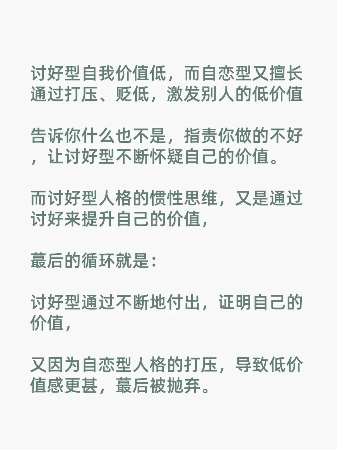 讨好型通过不断地付出,证明自己的价值,又因为自恋型人格的打压,导致低价值感更甚,最后被抛弃。