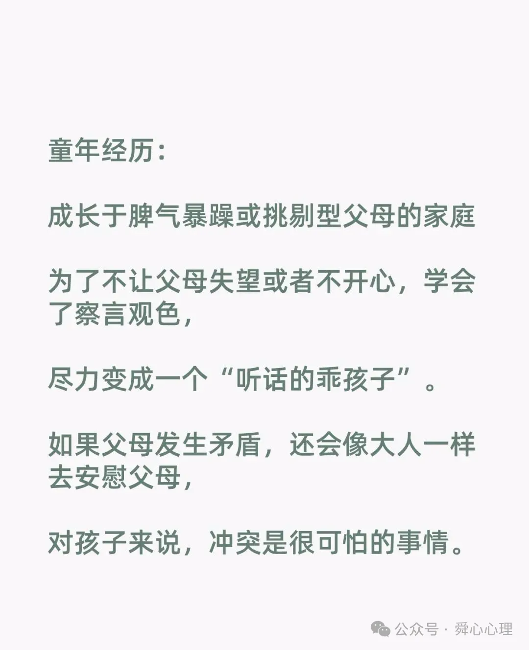 为了不让父母失望或者不开心,学会了察言观色,尽力变成一个“听话的乖孩子”。
