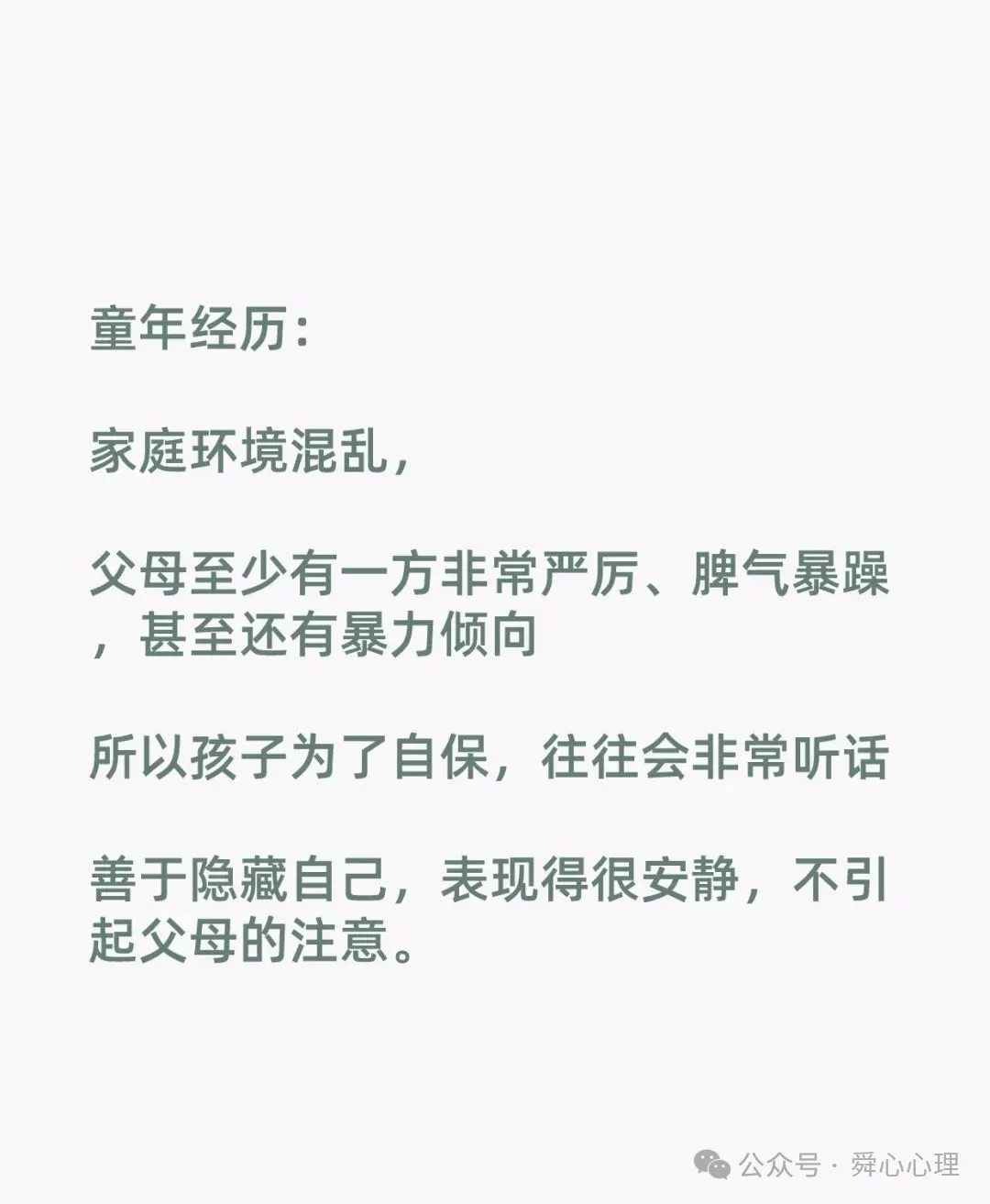 所以孩子为了自保,往往会非常听话,善于隐藏自己,表现得很安静,不引起父母的注意。