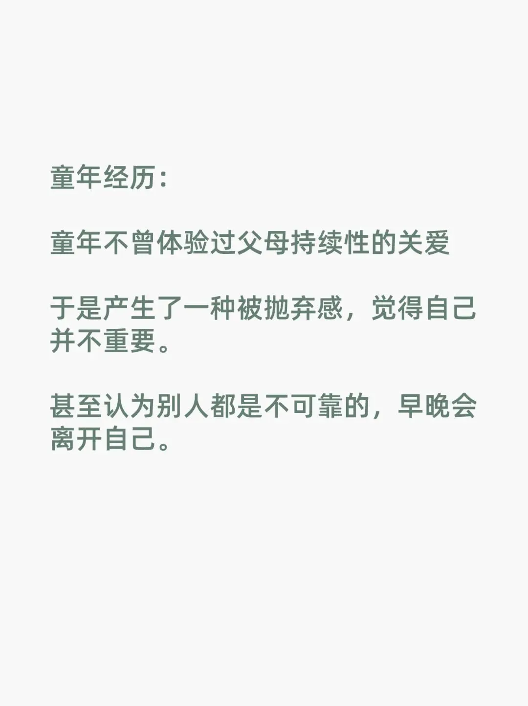童年不曾体验过父母持续性的关爱,于是产生了一种被抛弃感,觉得自己并不重要。